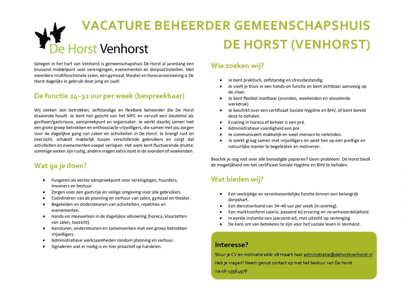 De Horst wordt geëxploiteerd door Stichting Gemeenschapshuis Venhorst. Het belangrijkste doel van de stichting is het beheren en exploiteren van het gemeenschapshuis zonder dat de stichting daarbij het maken van winst beoogt.